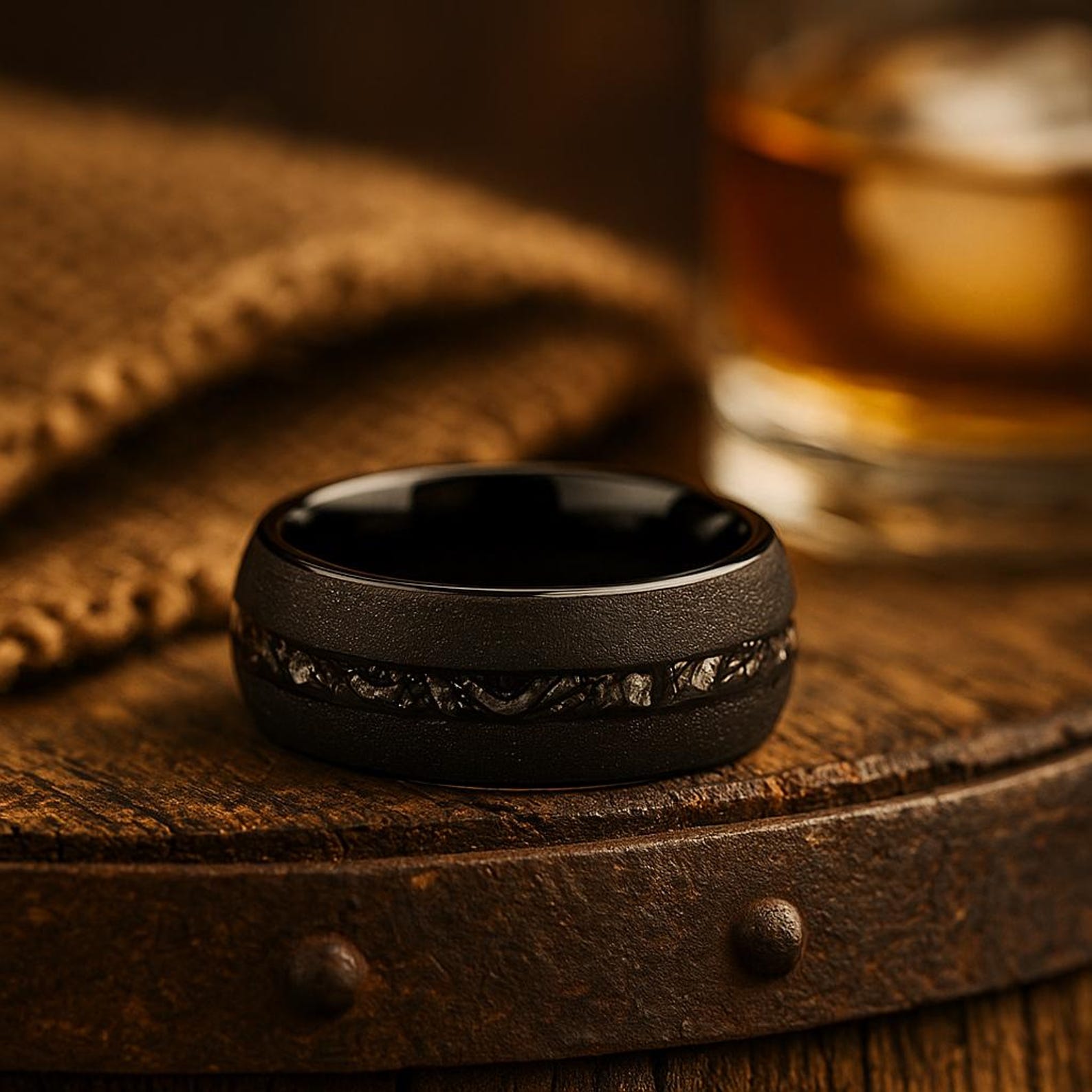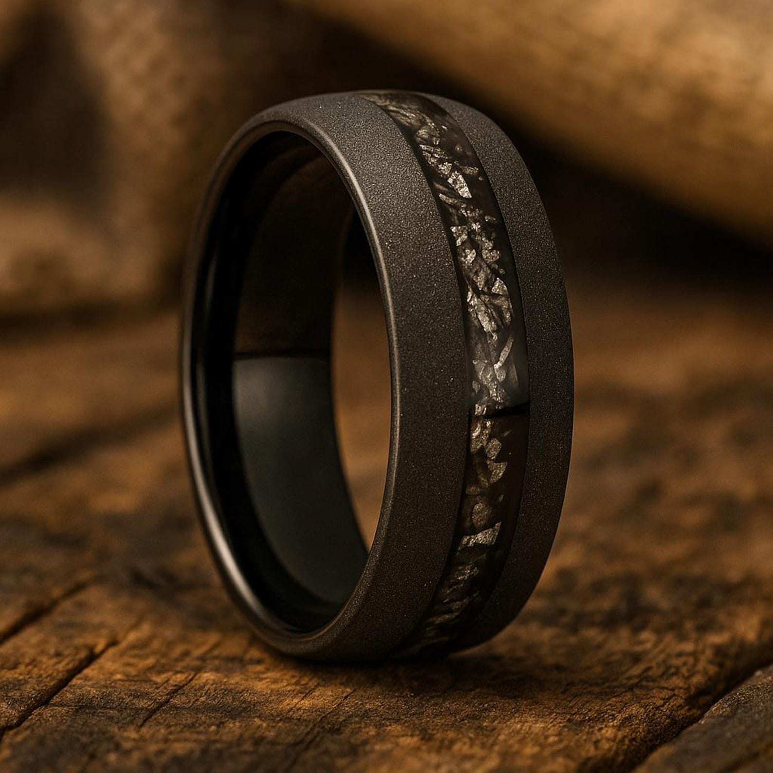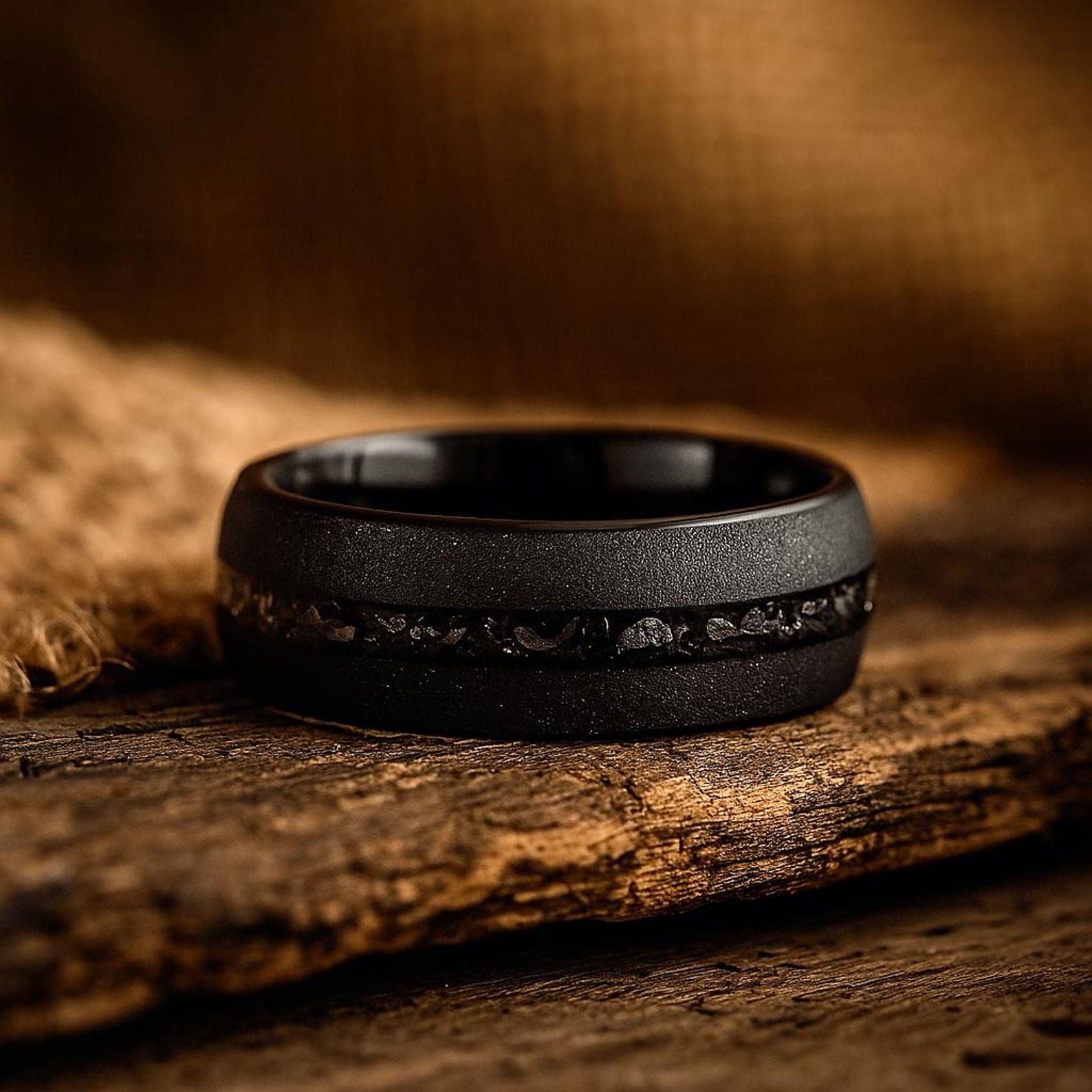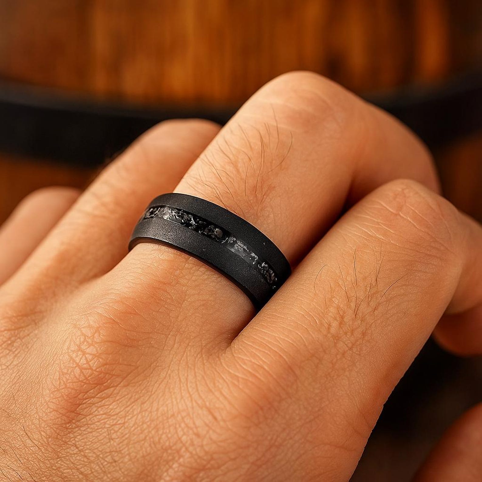The Voidcore is a black matte tungsten meteorite ring crafted in 8mm width, combining sleek minimal finish with bold cosmic texture and lasting durability.