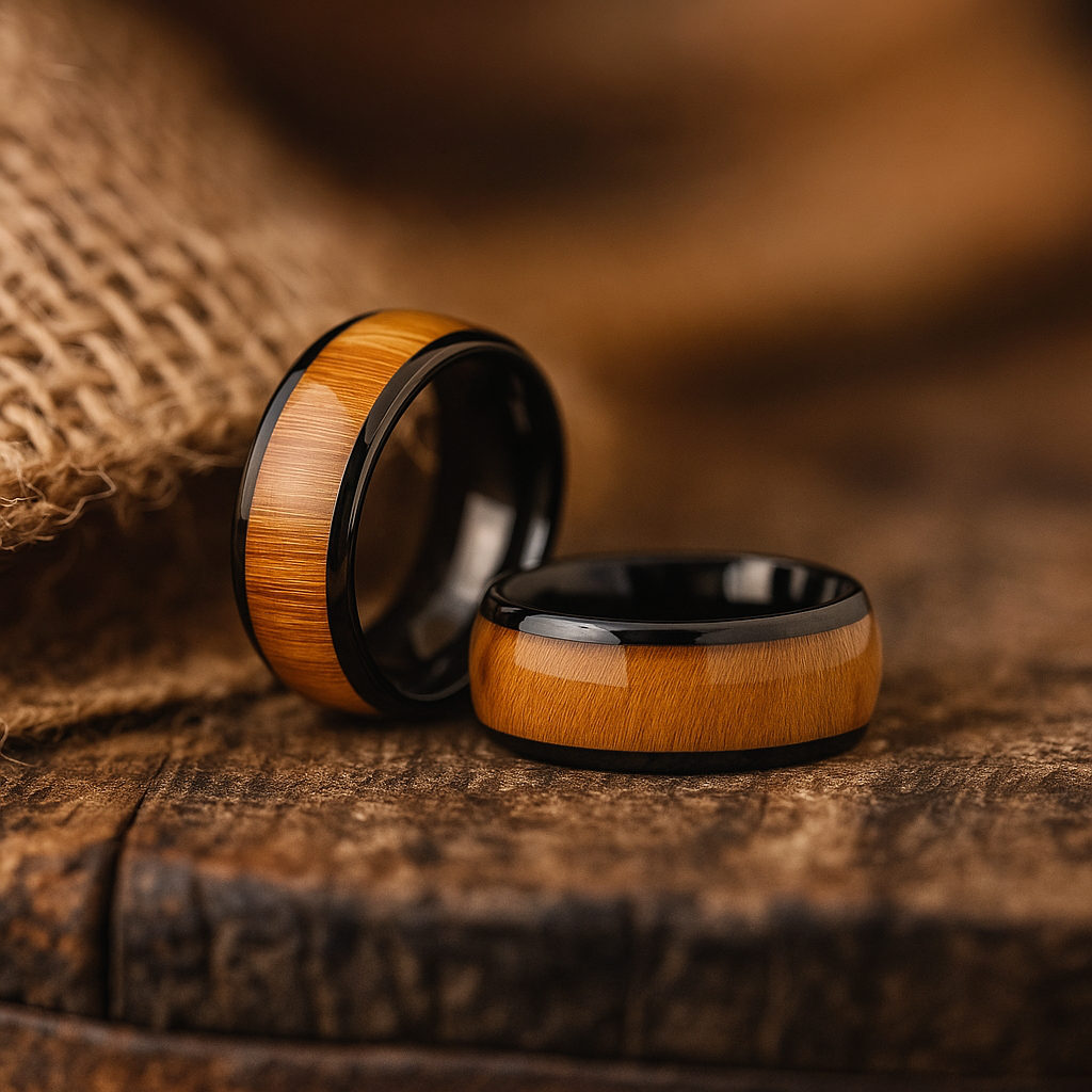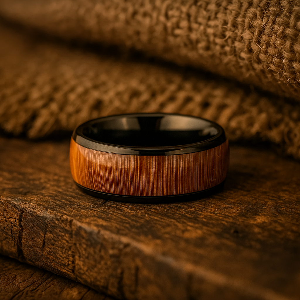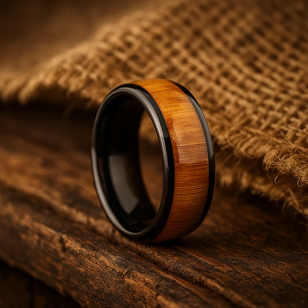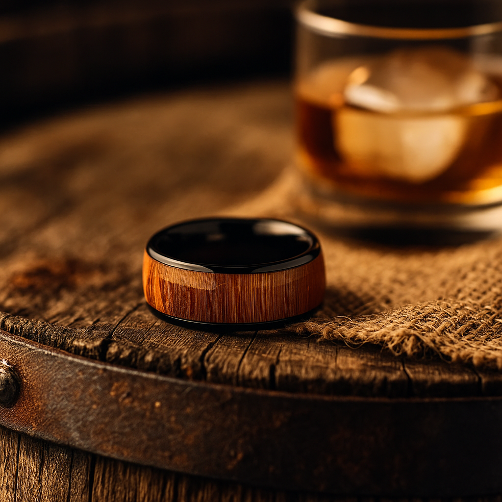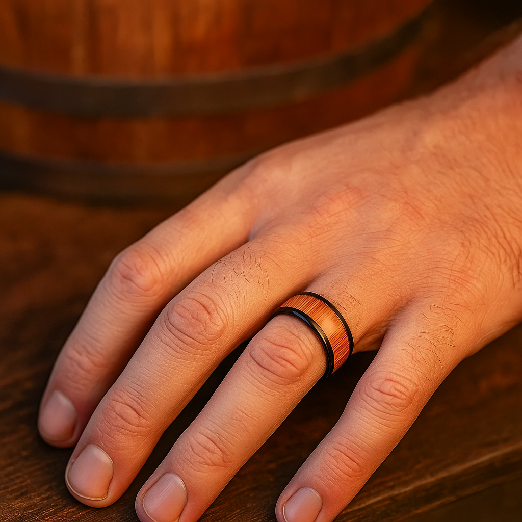 A modern black tungsten ring featuring a wide band of genuine barrel wood. Clean, warm, and minimal — perfect for men who prefer natural simplicity with lasting durability.