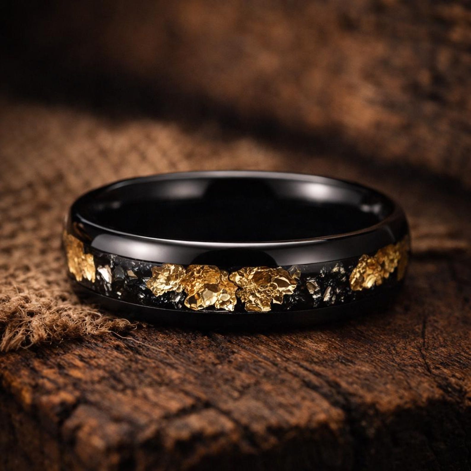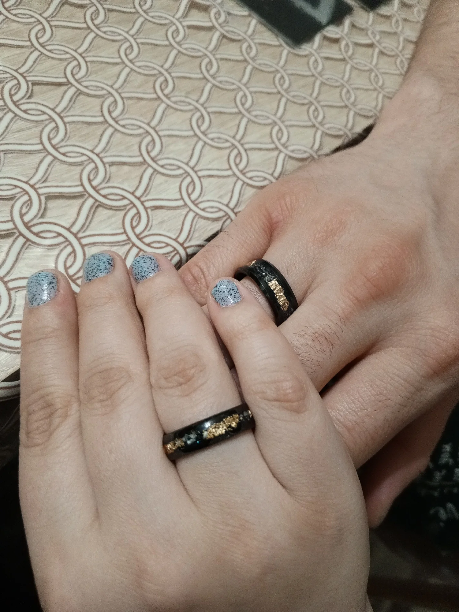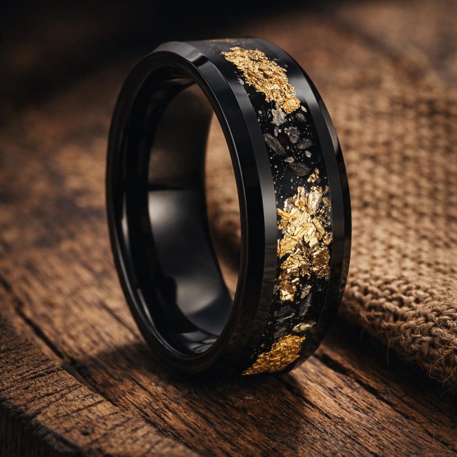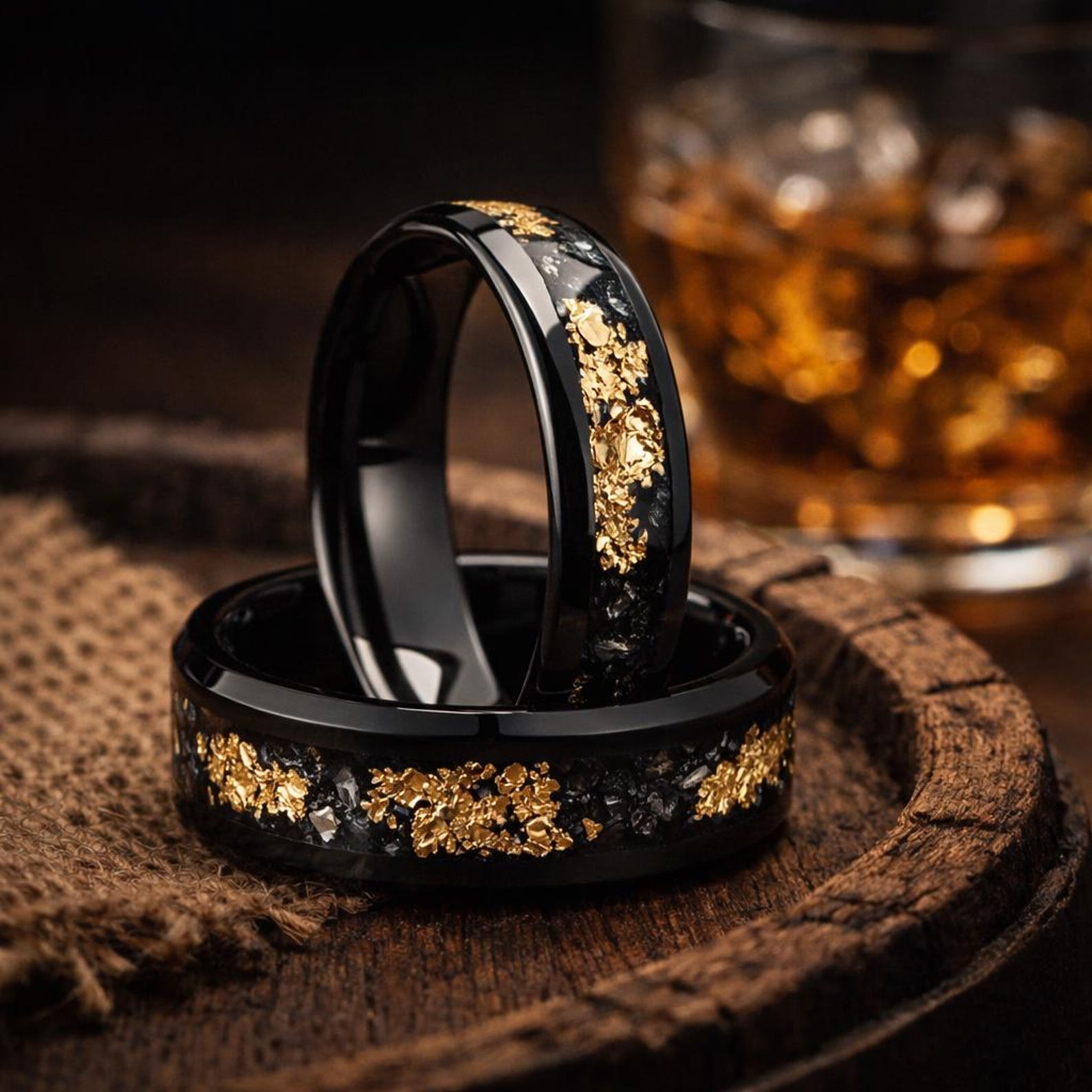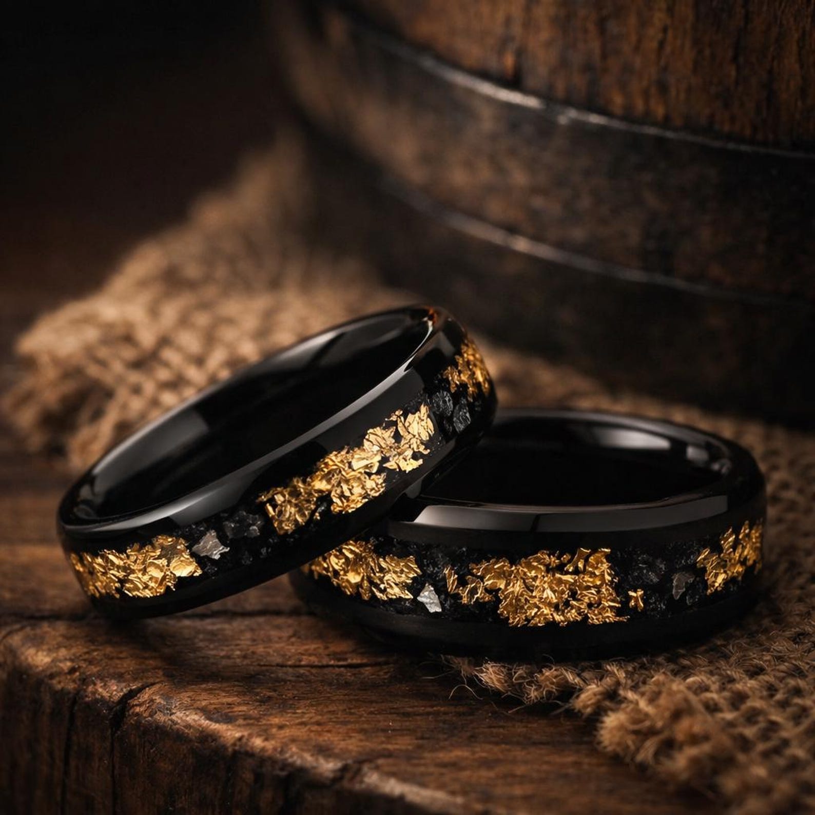 A matching set of black tungsten couple rings featuring crushed meteorite inlay with gold accents. Designed as a symbolic pair, these rings combine cosmic texture, deep black tones, and refined gold details — made to complement each other perfectly.