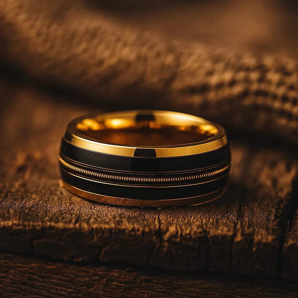 The Copperchord is a gold tungsten ring crafted in 8mm width, featuring a bold black inlay and guitar string detail that create striking contrast and distinctive musical character.