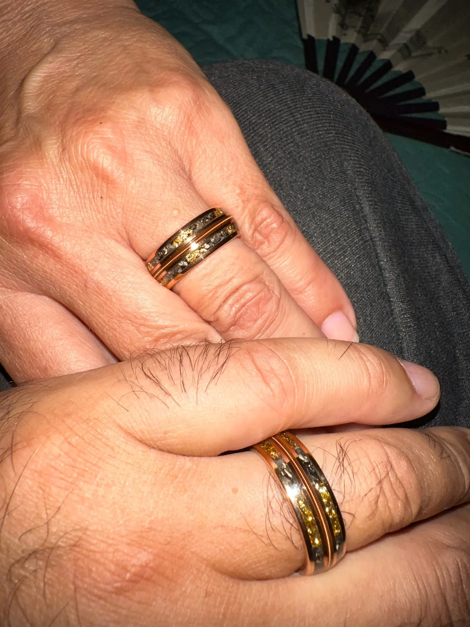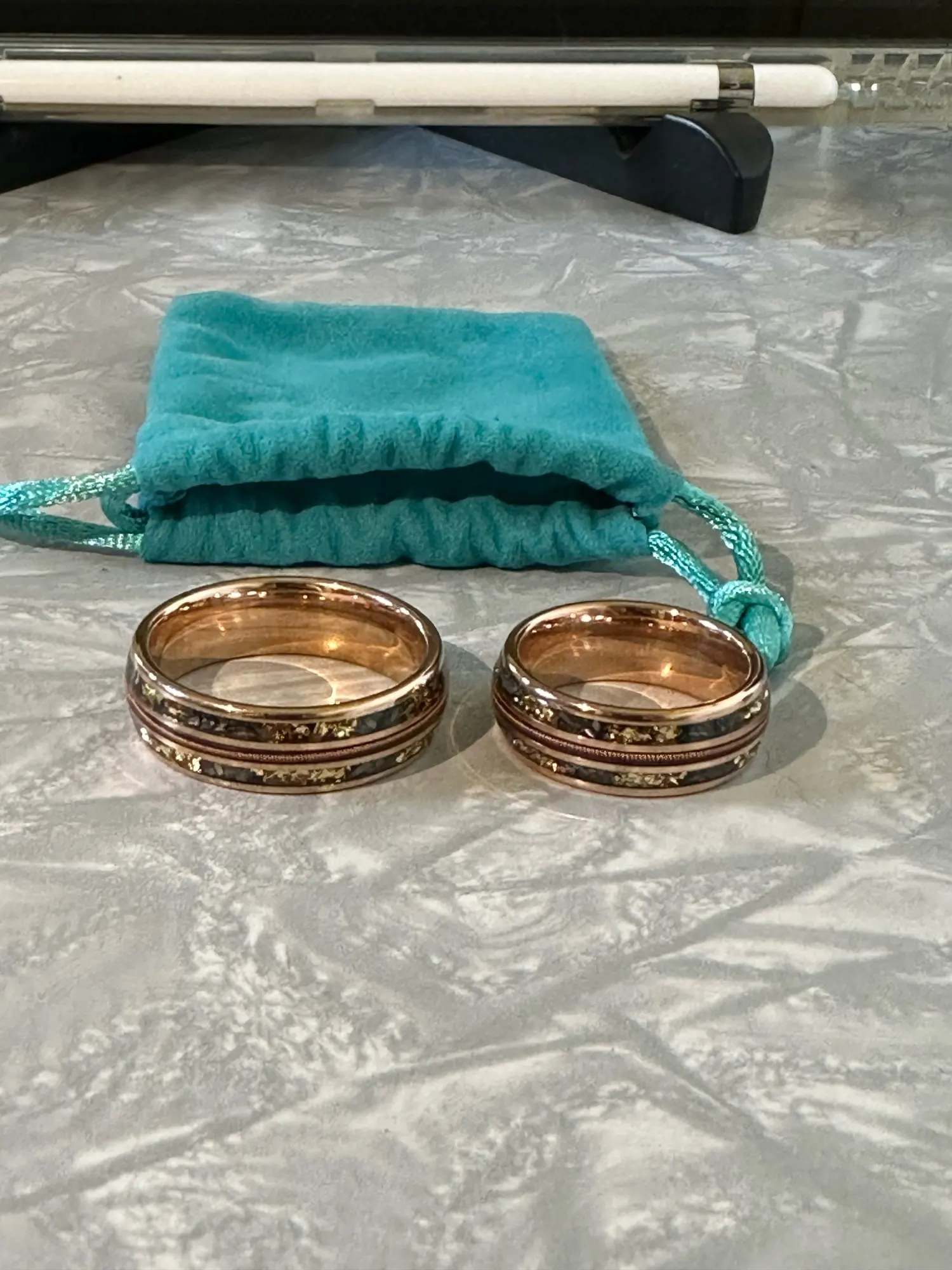 Each ring begins as high-density tungsten carbide, plated in a warm gold finish for a luxurious shine.