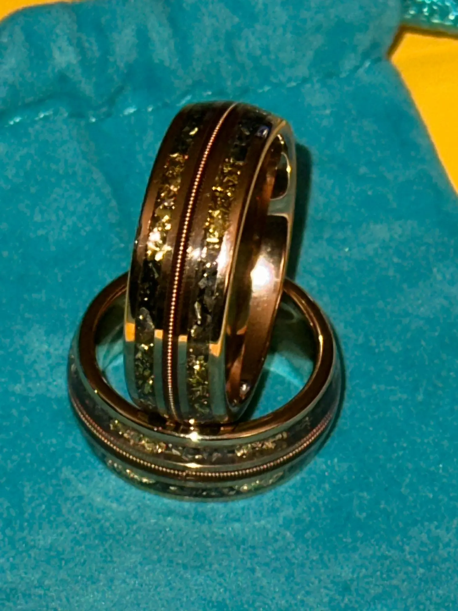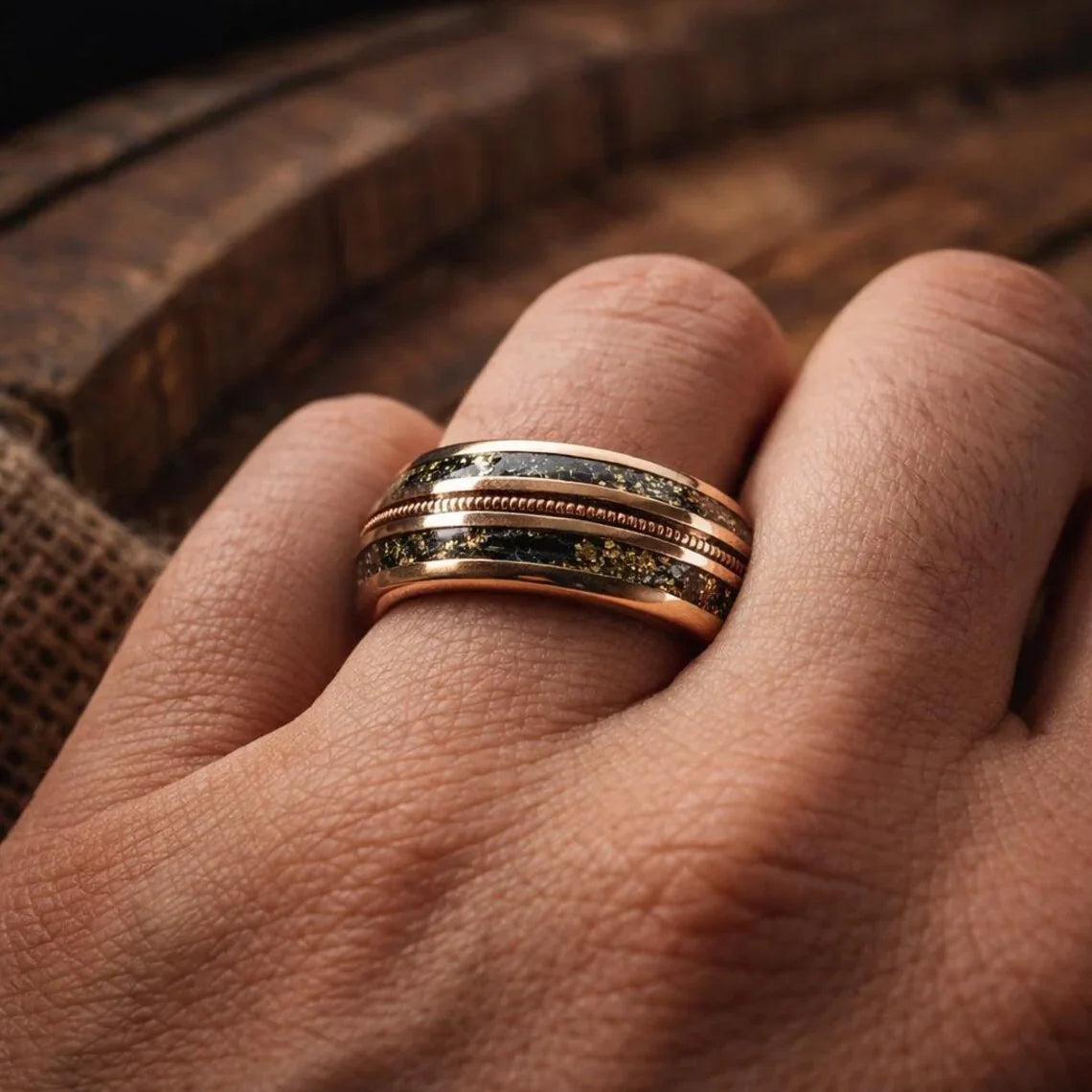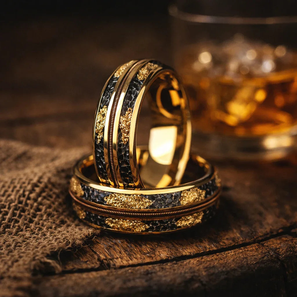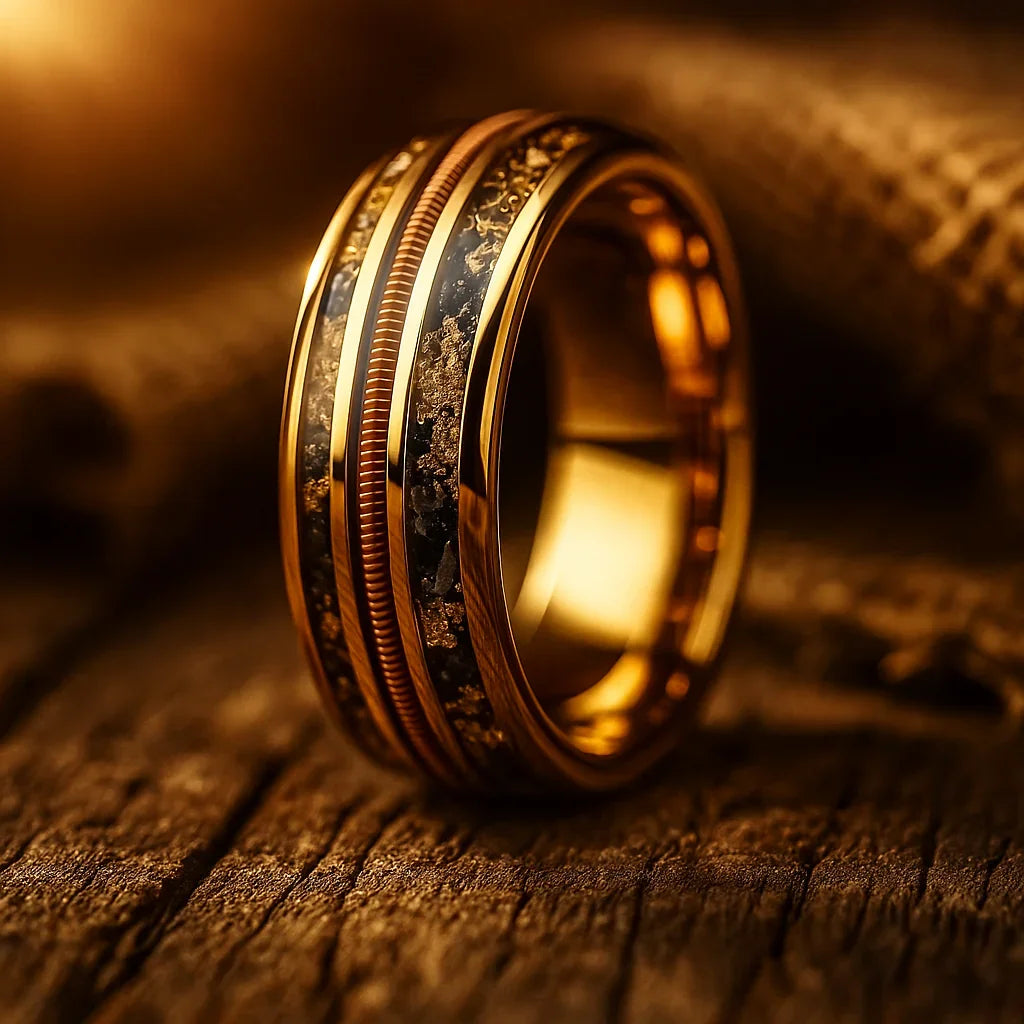 A striking gold-tone tungsten ring featuring a genuine meteorite inlay paired with an authentic guitar string. This design blends cosmic history with musical artistry — a bold, meaningful piece crafted for men who appreciate rare materials and refined style.