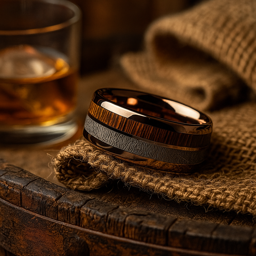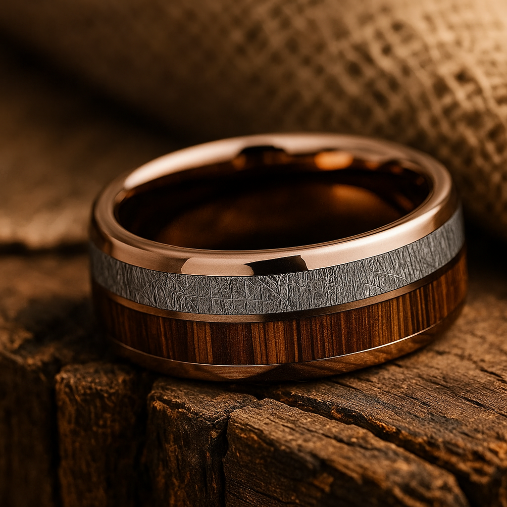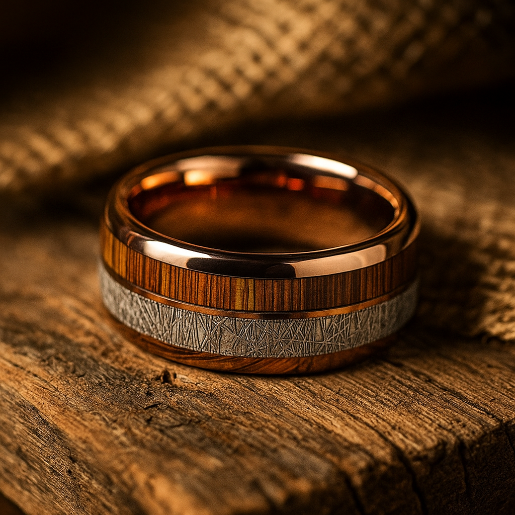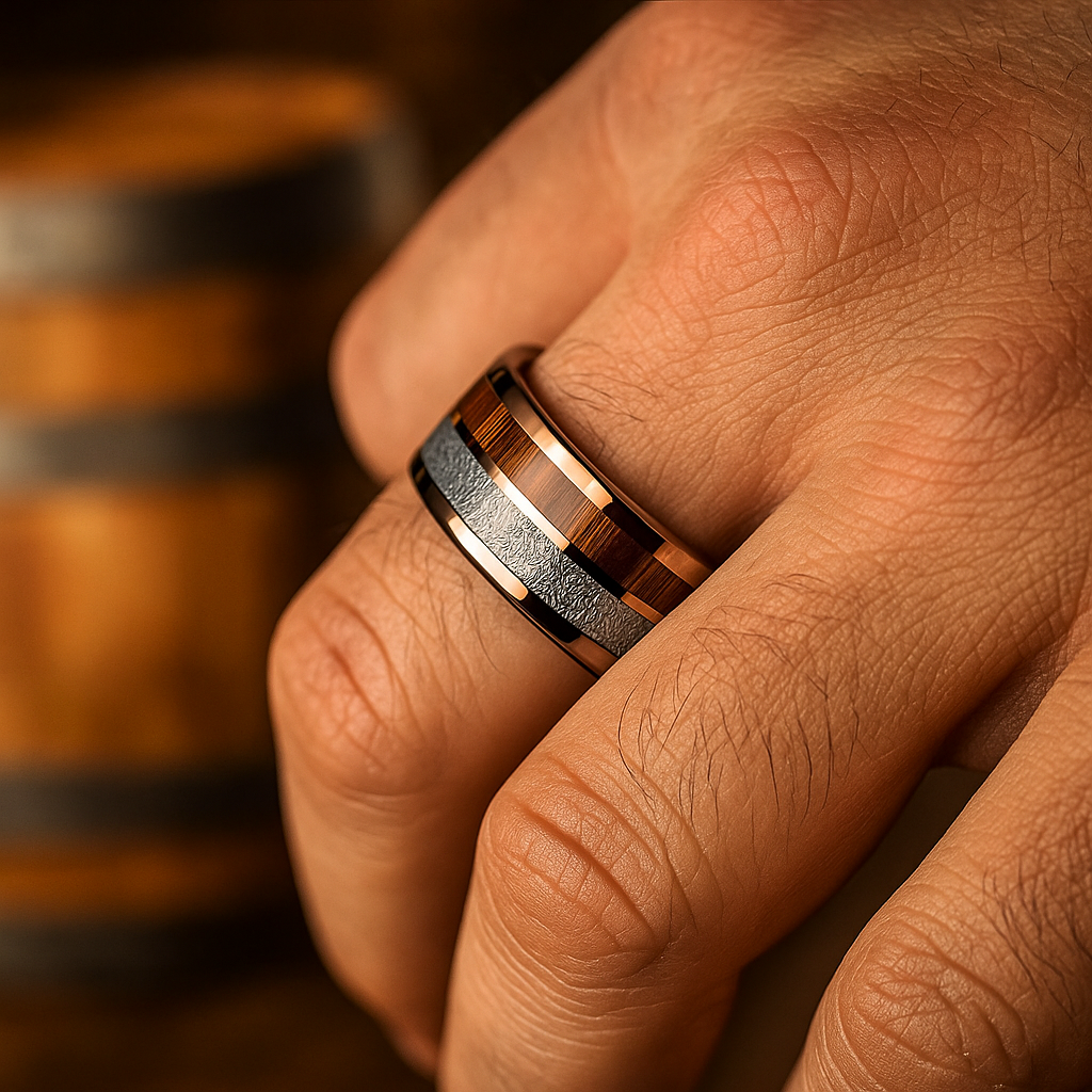 A polished rose-gold tungsten ring featuring a genuine barrel wood inlay and a textured etched metal center band. Designed for men who appreciate refined details and a warm, modern aesthetic.