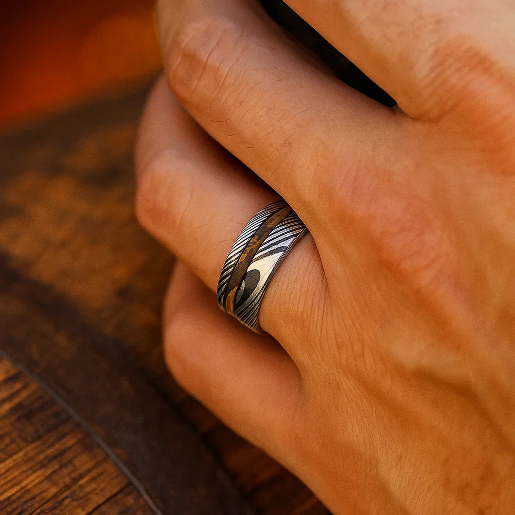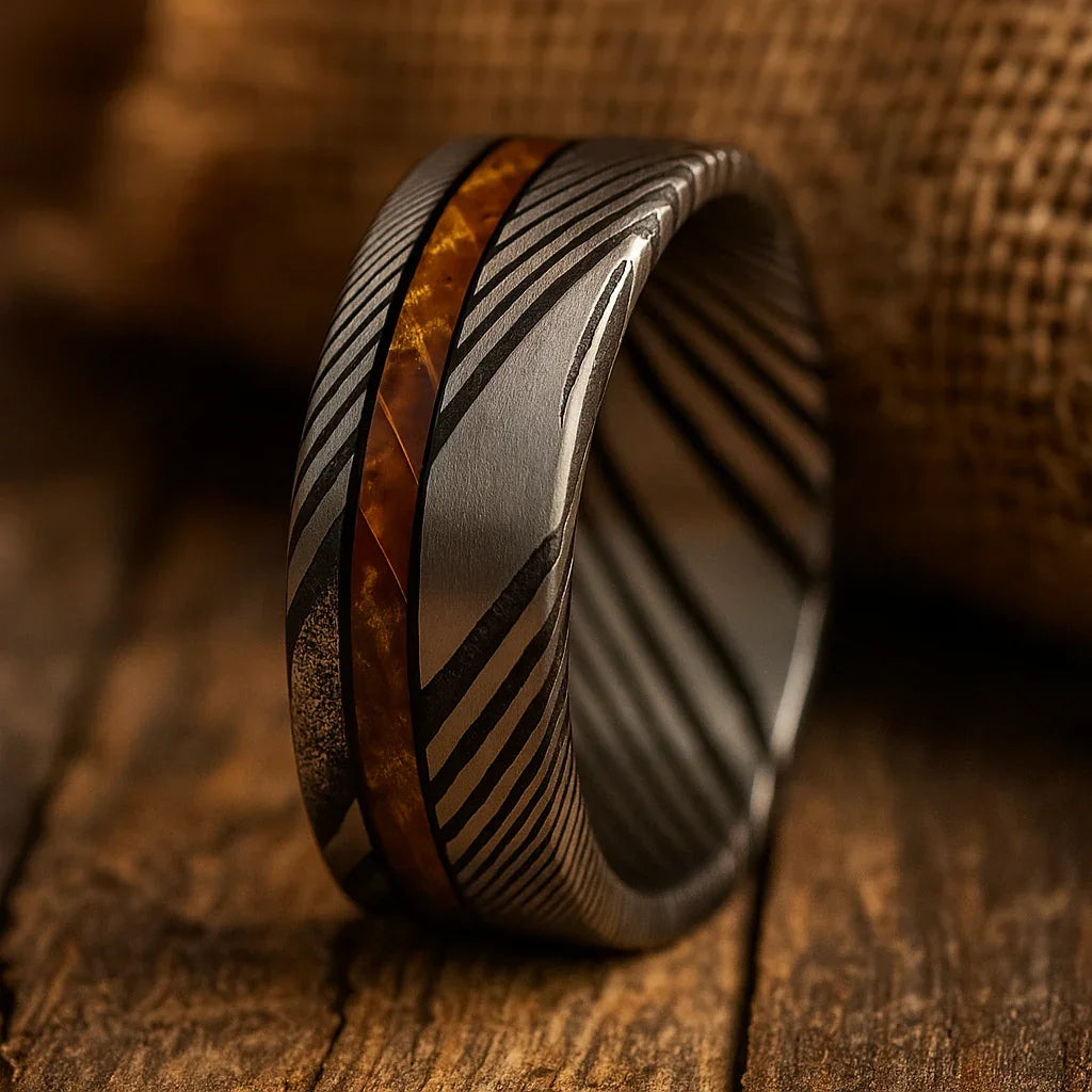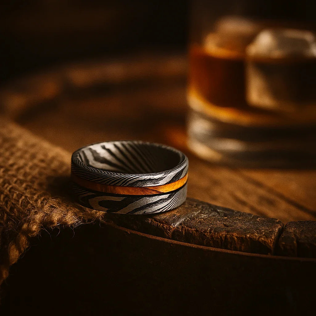 A striking Damascus steel ring featuring a warm barrel wood inlay set against bold, flowing metal patterns. A powerful combination of artisan forging and natural texture.