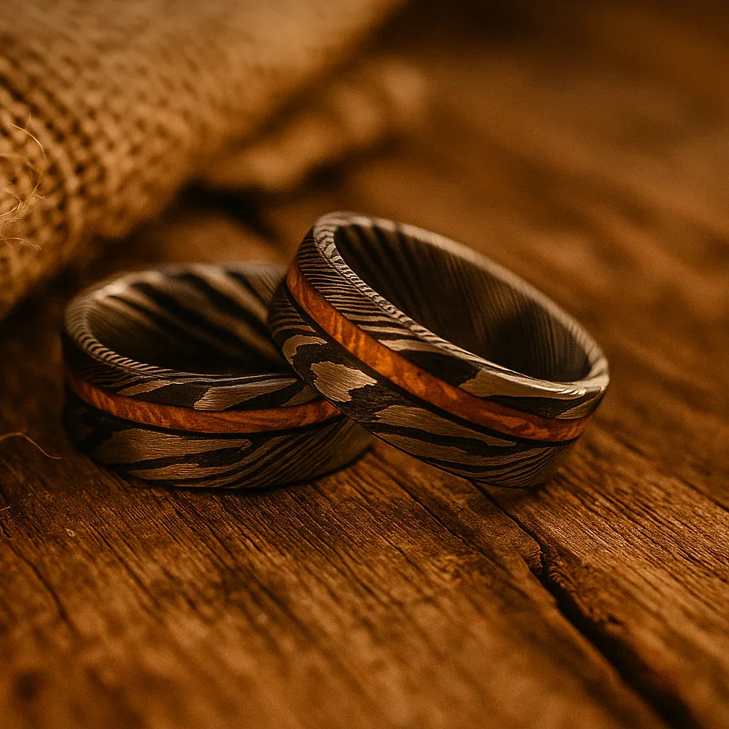 The wood is stabilized, shaped, and set into the ring, adding warm color and natural contrast to the cool steel.