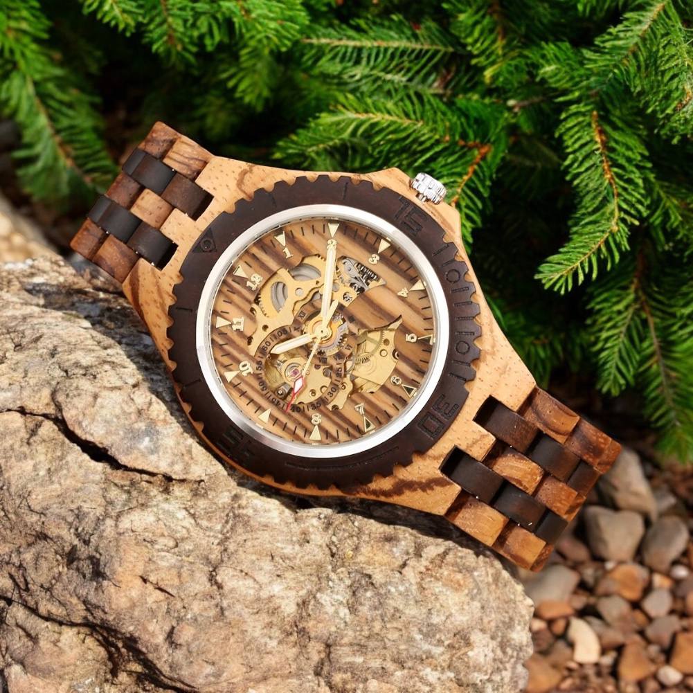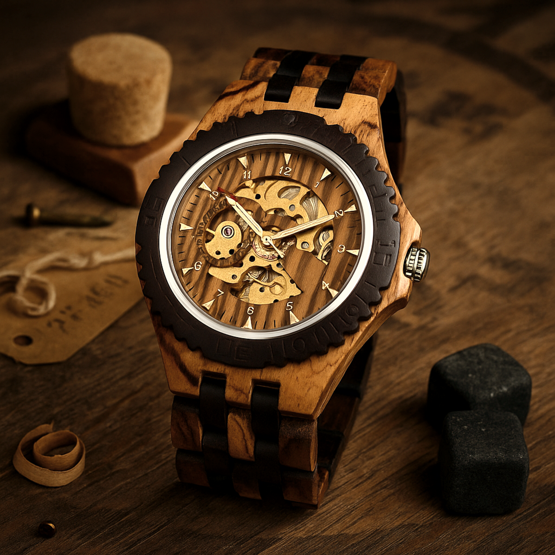 A rugged yet refined timepiece crafted from contrasting tones of barrel wood and powered by a fully exposed mechanical movement. The rich dark bezel, light wood case, and striped wooden dial create a bold, textured aesthetic that blends natural craftsmanship with precise engineering.