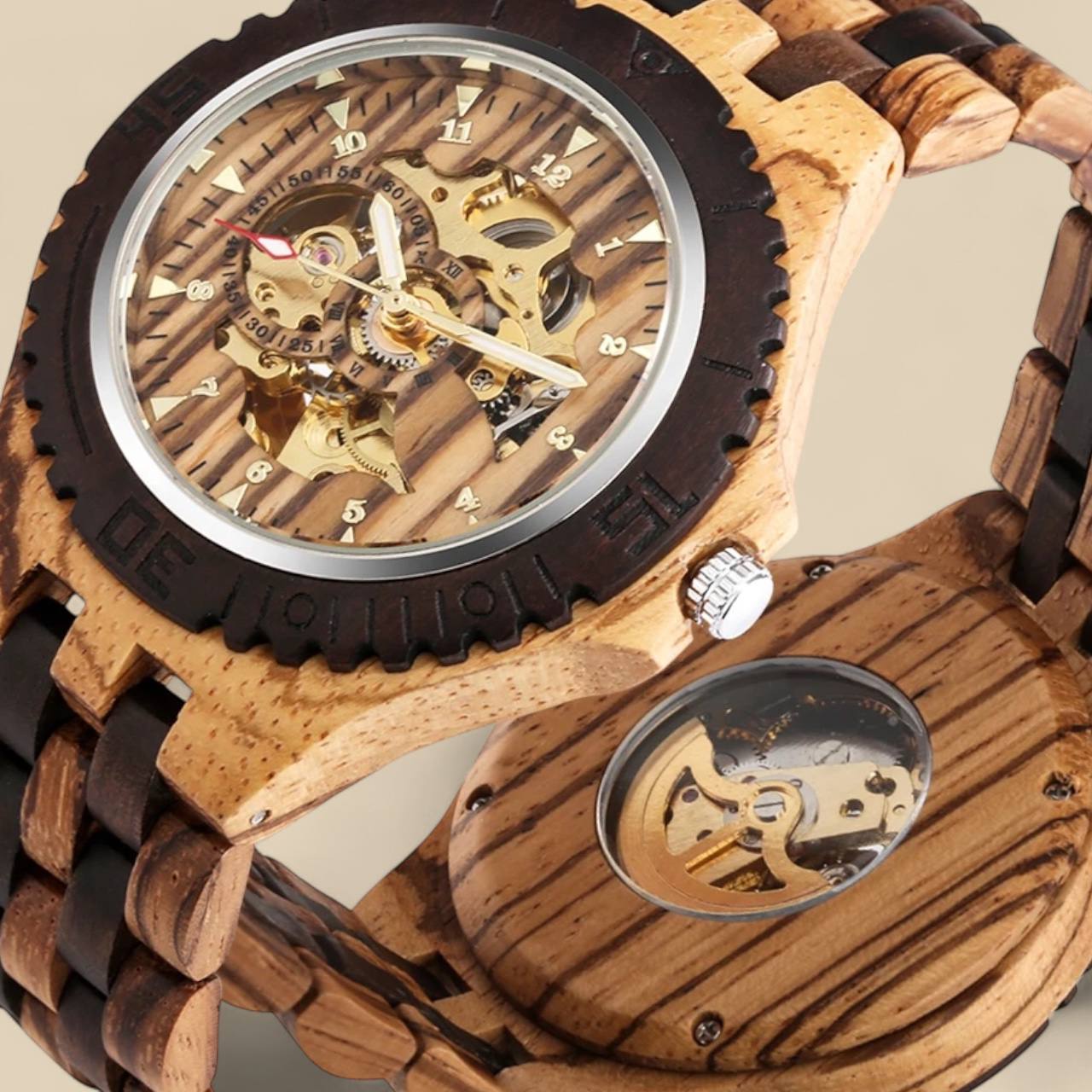 The interplay of light and dark wood paired with the golden mechanical core gives the Dualcrest a striking, dimensional character.
