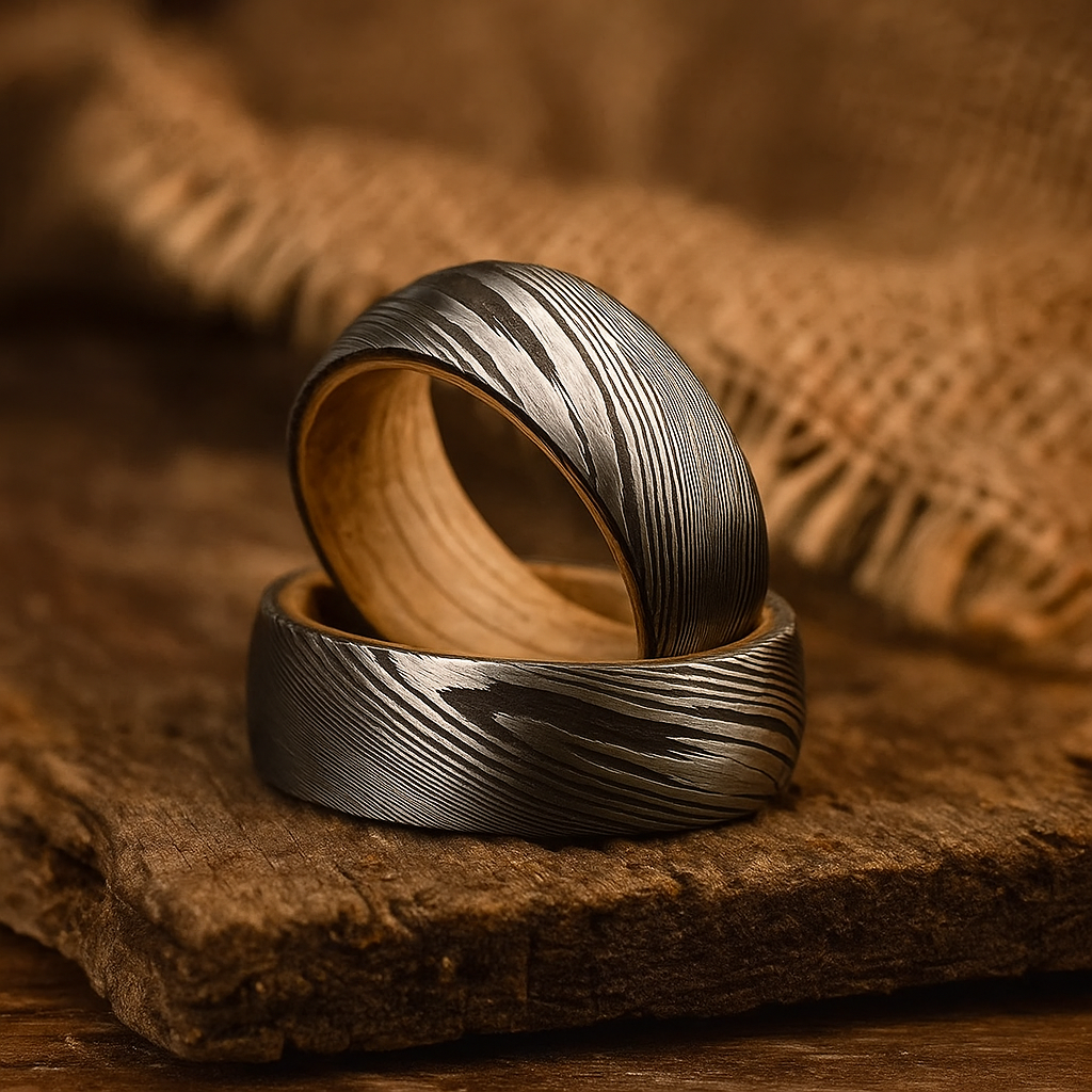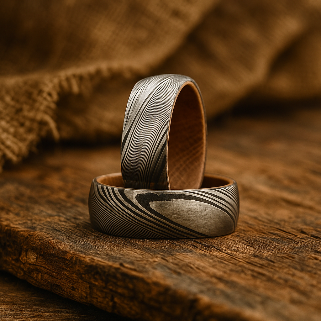 A bold Damascus steel ring with a warm barrel wood interior — combining ancient metalworking with natural wooden character. Strong on the outside, organic on the inside.